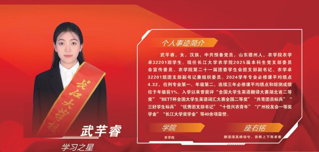 武芊睿,女,漢族,中共預(yù)備黨員,任長(zhǎng)江大學(xué)農(nóng)學(xué)院本科生黨支部委員會(huì)宣傳委員、農(nóng)學(xué)院團(tuán)委學(xué)生會(huì)團(tuán)支部副書(shū)記、農(nóng)學(xué)卓32201班團(tuán)支部副書(shū)記兼組織委員。她以“厚德篤行,豐實(shí)天下”為人生信條,在思想引領(lǐng)、學(xué)業(yè)科研、社會(huì)實(shí)踐中勇?lián)姑脢^斗書(shū)寫(xiě)新時(shí)代農(nóng)科學(xué)子的青春答卷。